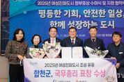 경남일간신문 | 합천군은 26일 성평등가족부가 주관한 ‘2025년 여성친화도시 정부포상 수여식’에서 경남 지역 유일하게 국무총리 표창을 수상했다. 2023년 11월 여성친화도시로 지정된 후 2년만에 이루어낸 쾌거이다. 앞서 성평등가족부는 ‘여성친화도시’로 지정된 106곳 중 1~4년차 도시 85곳을 대상으로 여성친화도시 이행 점검을 실시했고, 그중 합천군을 포함한 수상 후보 12개 지자체들의 공개검증을 통해 표창대상 기관으로 선정됐다. 여성친화도시 조성을 위해 합천군은 5개분야(성평등 추진기반 구축, 여성 경제‧사회 참여 확대, 지역사회 안전 증진, 가촉진화(돌봄) 환경 조성, 여성의 지역사회 활동역량 강화)에서 다양한 사업을 추진하고 있으며, 특히 마을안전공동체 사업(합천매화단디학교)와 합천형 육아 나눔 사업(아빠와 자녀 프로그램&엄마 힐링 프로그램, 농번기 찾아가는 돌봄사업 등)에서 높은 평가를 받았다. 김윤철 합천군수는 “여성친화도시로 선정된 지는 얼마 안됐으나 우리 군 고유의 특성화 사업으로 국무총리 표창이라는 영광을 안았다”며 “이번 수상을 계기로 앞으로도 군민을 위한 여성친화도시 조성에 최선을 다 하
