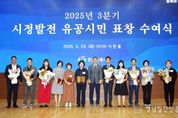경남일간신문 | 창원특례시는 23일 오전 10시 시청 시민홀에서 ‘2025년도 3분기 시정발전 유공시민 표창 수여식’을 개최했다. 이날 수여식에서는 지역사회와 시정 발전을 위해 묵묵히 봉사해 온 시민 100명이 수상의 영예를 안았다. 특히, 마산소방서 이보검 소방사와 경남경찰청 범죄예방대응과 백정한 경감은 소중한 시민의 생명을 구한 유공 의인으로 인정받아 표창패를 수여받으며 참석자들의 큰 박수를 받았다 이보검 소방사는 퇴근길 마창대교 난간에서 극단적 선택을 하려던 시민을 설득해 구조했으며, 백정한 경감은 실종 신고된 치매 어르신을 적극 수색해 무사히 구조하는 등 시민 안전을 지켰다. 장금용 창원특례시장 권한대행은 “지역과 이웃을 위해 헌신하신 수상자 여러분께 진심으로 감사드린다”며, “창원시는 앞으로도 묵묵히 봉사하는 분들이 존중받고 격려받을 수 있도록 적극 지원하겠다”고 말했다.
