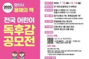 경남일간신문 | 양산시에서 7월 15일부터 ‘2025년 양산시'올해의 책' 전국 어린이 독후감 공모전’을 개최한다고 밝혔다. 이번 공모전은 전국 초등 3~6학년이 참여할 수 있으며, 초등 3~4학년과 초등 5~6학년으로 응모 부문이 나뉘어 진행된다. 응모 기간은 7월 15일부터 9월 14일까지이다. 이번 독후감 공모전 선정도서로 양산시 올해의 책 선전도서인 ‘달걀이 탁!’(고이 저), 초등 3~4학년 권장도서‘나를 찾아 줘’(김탄리 저), 초등 5~6학년 권장도서‘들개왕’(곽영미 저)이 선정됐다. 참여자는 자신의 응모 부분에 상관없이 선정도서 중에서 자유롭게 선택하여 독후감을 작성하면 된다. 독후감은 신청서와 함께 양산시립도서관 홈페이지에 온라인 제출하거나, 양산시립도서관 각 도서관 자료실을 방문하여 제출할 수 있다. 입상자는 오는 10월 중에 발표할 예정이며, 입상자에게는 양산시장상과 소정의 상금이 지급될 예정이다. 그 외 자세한 사항은 양산시립도서관 홈페이지를 참고하면 된다. 양산시 관계자는 “매년 양산 시민들을 대상으로 진행되던 어린이 독후감 공모전이 올해 처음으로 전 국민을 대상으로 확대했다