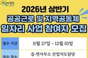 경남일간신문 | 합천군은 2026년 상반기 공공근로 52명 및 지역공동체일자리사업 17명의 참여자를 각각 모집한다고 밝혔다. 접수기간은 11월 27일부터 12월 10일까지이며, 주소지 소재의 읍면사무소 산업지도담당을 방문하여 신청하면 된다. 취업취약계층 및 저소득층의 생계안정과 지역경제 활성화를 위하여 실시하는 공공일자리사업의 참여대상은 ▲만 18세 이상 합천군민으로서 ▲가구소득이 기준중위소득 60% 이하 ▲재산이 3억원 이하인 자이다. 사업기간은 내년 1월 12일부터 6월 30일까지이며, 주요 근무조건으로 ▲시간당 임금 10,320원 ▲간식비 5,000원 ▲주휴수당 및 연차, 유급휴일 제공이 있다. 각 사업별 공고문과 신청서류는 합천군 홈페이지'분야포털'채용공고에서 확인할 수 있다.