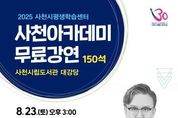 경남일간신문 | 사천시는 사천방문의 해를 맞아 ‘2025년 사천아카데미 제3강’ 강좌를 8월 23일 토요일 오후 3시 사천시립도서관에서 개최한다. 이번 강좌는 썬킴 작가를 초빙해 ‘썬킴의 거침없는 세계사’라는 주제로 진행된다. 썬킴 작가는 서던캘리포니아대학교 대학원에서 언론학을 전공하고 영어 강사 및 역사 스토리텔러 방송인으로 활동하고 있으며, 저서로는 '썬킴의 거침없는 세계사', '시추에이션 여행영어' 등이 있다. 참여 희망자는 사천시립도서관 홈페이지에서 강좌 1주 전인 8월 16일 토요일 오전 10시부터 예매(1인 2매, 선착순 마감)하여야 수강이 가능하고, 수강료는 무료이다. 자세한 내용은 사천시평생학습센터 평생학습팀 또는 도서관관리팀으로 문의하면 된다.