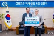 경남일간신문 | 경상국립대학교는 7월 16~20일 집중호우에 따른 수해 지역 및 이재민을 돕기 위한 성금 1305만 원을 경남사회복지공동모금회에 전달했다. 성금 전달식은 8월 22일 오전 가좌캠퍼스 대학본부 3층 접견실에서 권진회 총장, 이성갑 교학부총장, 오재신 국제처장과 경남사회복지공동모금회 강기철 회장, 박은덕 사무처장, 이숙미 모금사업팀장 등이 참석한 가운데 마련됐다. 경상국립대학교는 경남을 대표하는 국가거점국립대학으로서 지역사회의 아픔을 함께 나누고 조속한 피해 복구를 돕기 위해 7월 28일부터 8월 5일까지 교직원을 대상으로 모금을 진행했다. 이에 경상국립대학교 교직원 288명이 1305만 원을 자발적으로 모금했다. 한편, 경상국립대학교는 지역사회와의 연대를 강화하고 피해를 본 지역민들의 복구 의지에 힘을 실어주기 위해 봉사활동을 적극 펼쳤다. 경상국립대학교 사회공헌센터는 7월 30일 GNU봉사단, 학생자치기구, 일반 학생 등 100여 명이 참여한 가운데 산청군에서 무너진 비닐하우스와 농막을 정리하는 봉사활동을 실시했다. 7월 23일에는 교직원 73명이 참가한 가
