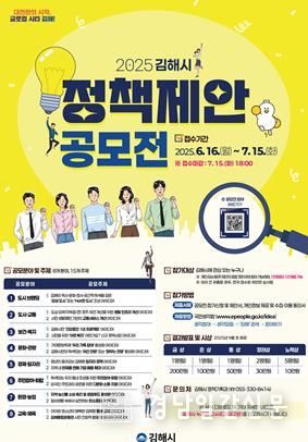 경남일간신문 | 김해시는 행정 중심의 사고에서 벗어나 시민의 창의성과 실용적 감각이 담긴 정책 아이디어를 발굴하고자 ‘2025년 김해시 정책 제안 공모전’을 개최한다고 16일 밝혔다.
