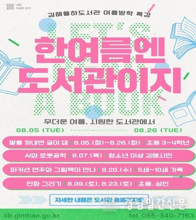 경남일간신문 | 김해율하도서관은 여름방학을 맞아 8월 한 달간 아이부터 어른까지 함께 즐길 수 있는 다양한 독서문화 프로그램을 운영한다고 15일 밝혔다.