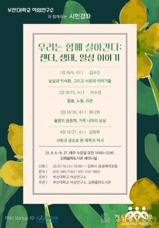 경남일간신문 | 김해율하도서관은 부산대학교 여성연구소와 협업하여 오는 8월부터 한 달간 매주 수요일마다 시민을 대상으로 ‘우리는 함께 살아간다’ 시민강좌를 운영한다고 15일 밝혔다.