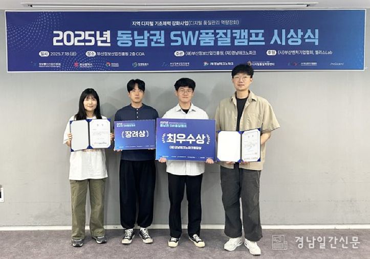 경남일간신문 | 경상국립대학교(GNU·총장 권진회) IT공과대학 AI융합공학과 시스템연구실(Systems Research Lab, 지도교수 이성진) 소속 학생들이 경남테크노파크와 부산정보산업진흥원이 공동으로 개최한 ‘2025 동남권SW품질캠프’에서 최우수상·장려상을 수상했다.