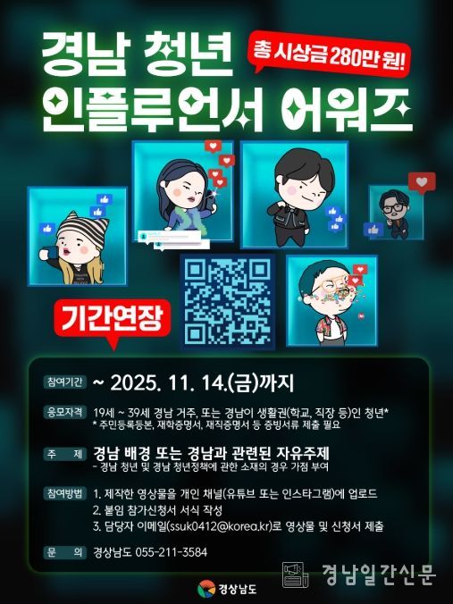 경남일간신문 | 경남도가 더 많은 참여를 독려하고 우수 작품을 발굴하기 위해 14일까지 ‘2025 경남 청년 인플루언서 어워즈’ 접수 기간을 2주간 연장한다.
