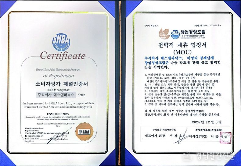 또한 12월3일 .(주)에스앤파낙스(서정호 대표)는 대한민국 소비자평가 단체 창업경영포럼과 전략적제휴 및 우수기업으로 인증 받으며 글로벌 시장으로 발돋움하는 계기를 마련했다.