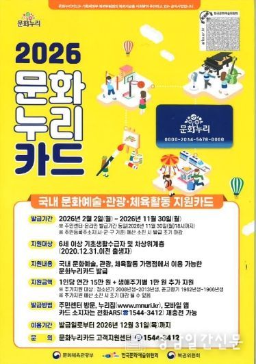 문화누리카드는 문화생활을 누리기 어려운 6세 이상 기초생활수급자와 차상위계층에게 지원하는 지원금으로, 2026년부터는 지원 금액이 기존 14만 원에서 15만 원으로 1만 원 인상해 지급된다.