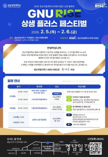 경남일간신문 | 경상국립대학교 라이즈(RISE) 사업단(단장 황세운)은 2월 5~6일 가좌캠퍼스 GNU 컨벤션센터 대강당 일원에서 RISE사업의 1차 연도 성과발표회 및 기업지원정책 설명회 ‘GNU RISE 상생 플러스 페스티벌’을 개최한다.