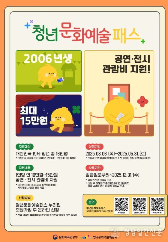 한편, 청년문화예술패스에 대한 문의 사항은 청년문화예술패스 고객지원센터 또는 청년문화예술패스 누리집을 통해 확인할 수 있다.