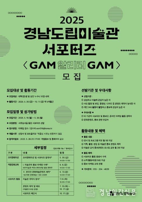 경남일간신문 | 경남도립미술관은 미술관 홍보활동을 지원하는 서포터즈GAM 알리러 GAM을 모집하고, 선발된 서포터즈는 5월 30일부터 10월 17일까지 약 5개월간 온라인 홍보활동을 진행한다고 밝혔다.