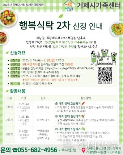 경남일간신문 | 거제시가족센터는 맞벌이가정의 가사 부담을 완화하고 양성 평등한 가족문화 조성을 위해 ‘행복식탁’ 2차 참여자를 모집한다.