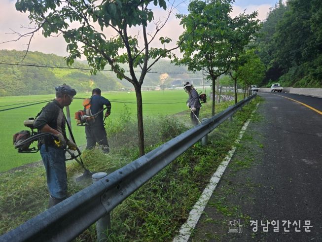 경남일간신문 | 합천군 대양면 안금리(이장 윤재호) 청년회 회원들이 마을 진입로 풀베기 작업과 환경정화 활동을 자발적으로 실시해 주민들의 호평을 받았다.