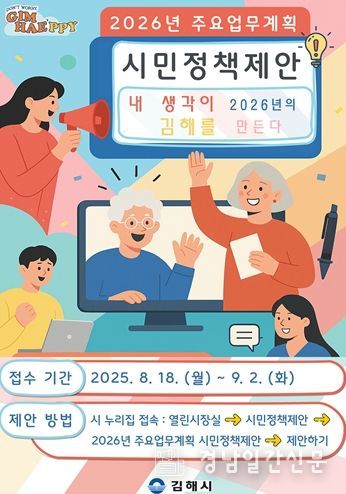‘내 생각이 2026년의 김해를 만든다’란 주제 아래 8월 18일부터 9월 2일까지 김해시민 누구나 내년도에 희망하는 사업들을 분야별로 제안할 수 있다.