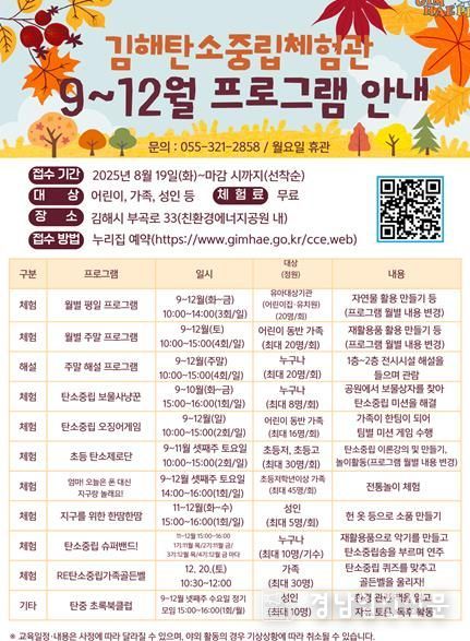 박성욱 김해시 기후대응과장은 “시민들이 보다 쉽고 재미있게 환경을 배우고 실천할 수 있도록 프로그램을 개편했다”며 “가족·친구와 함께 특별한 추억을 만들고 환경도 지킬 수 있는 기회가 되길 바란다”고 말했다.