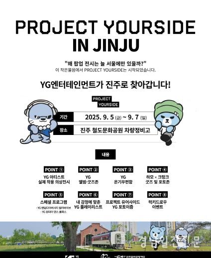 경남일간신문 | 진주문화관광재단(대표이사 왕기영)은 오는 9월 5일부터 7일까지 3일간 진주시 철도문화공원 차량정비고 및 공원 일원에서 'PROJECT YOURSIDE 진주'를 개최한다고 밝혔다.