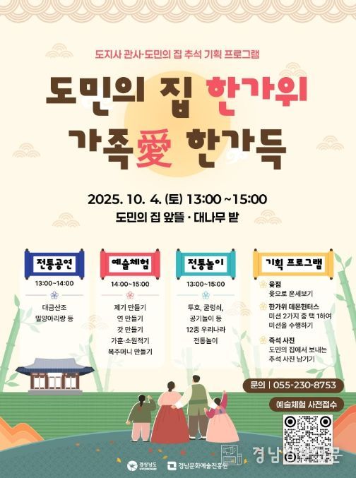 경남일간신문 | 경상남도는 10월 4일 오후 1시부터 3시까지 도심 속 복합문화공간 활성화를 위해 추석을 맞아 귀향객과 도민이 함께 즐길 수 있는 기획 프로그램 ‘도민의 집 한가위, 가족愛 한가득’을 개최한다고 밝혔다.
