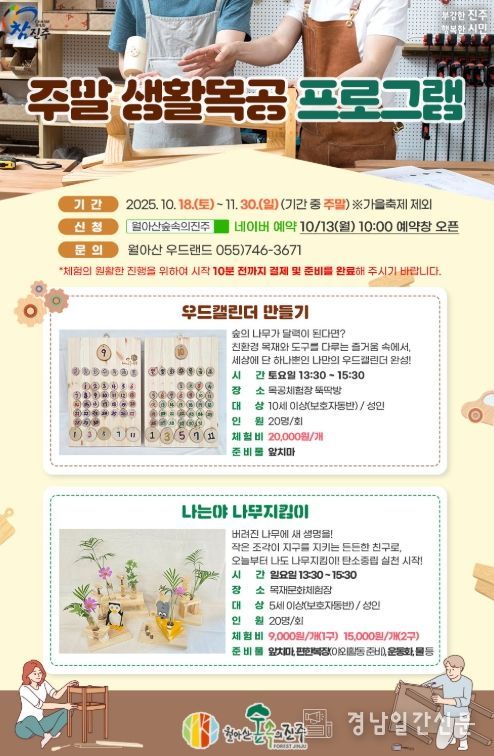경남일간신문 | 진주시는 오는 18일부터 ‘월아산 숲속의 진주’에서 시민들의 다양한 목공체험과 이를 실용적 생활목공의 경험으로 확대하기 위한 ‘주말 생활목공’ 프로그램을 운영한다고 밝혔다.