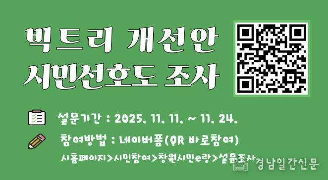 경남일간신문 | 창원특례시는 11월 11일부터 24일까지 2주간 ‘빅트리 개선안 시민 선호도 조사’를 실시한다.