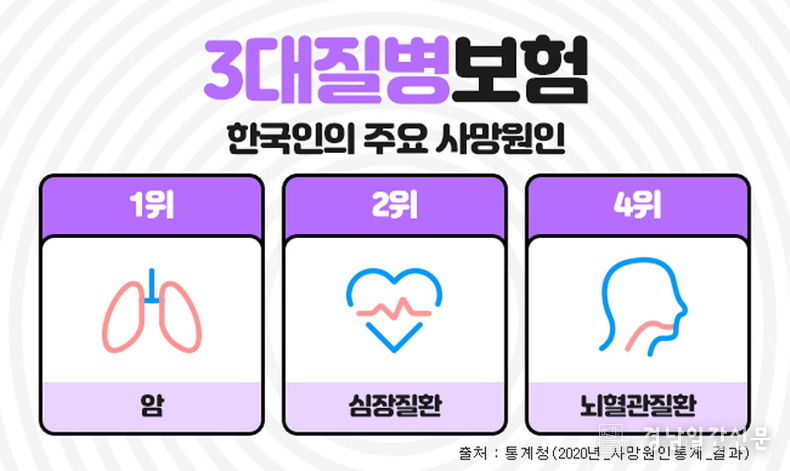 경남일간신문 | 한국인의 주요 사망원인중에 암, 뇌혈관질환, 심혈관질환은 흔히 3대질병이라 일컬어지며 살아가면서 가장 먼저 대비해야 하는 중대질병으로 항상 강조되고 있다. 이들 질병에 미리 대비하기 위해 가입하는 것이 진단비보험인데, 이러한 3대질병진단비를 중점으로 보장하는 보장성보험이 3대진단비보험 이다. 3대질병진단비보험은 각각의 질병에 주목해서 보장하기도 하지만, 나에게 맞는 추가 특약을 잘 골라서 가입한다면 종합건강보험으로도 충분히 활용도가 높다.