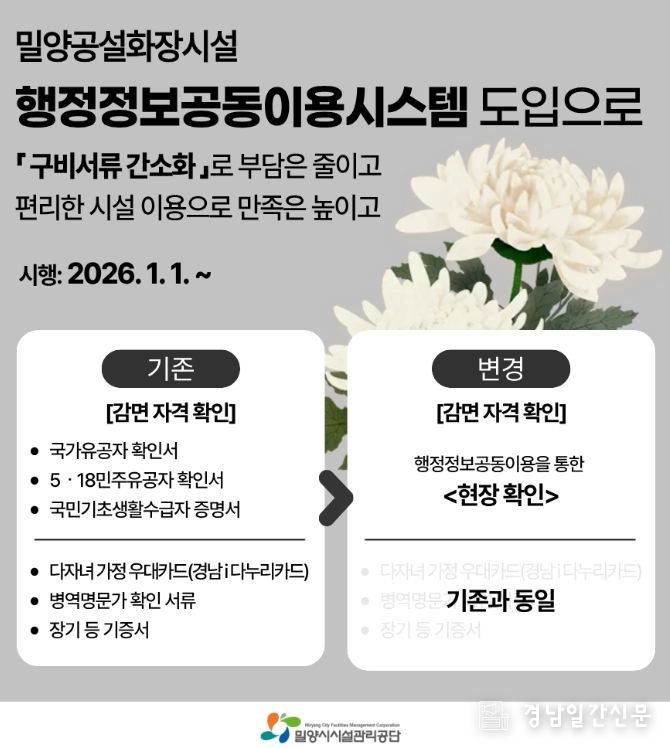 경남일간신문 | 밀양시시설관리공단은 밀양공설화장시설을 이용하는 유가족의 편의를 높이기 위해 구비서류를 간소화하는 ‘행정정보 공동이용 시스템’을 오는 1월 1일부터 시행한다.