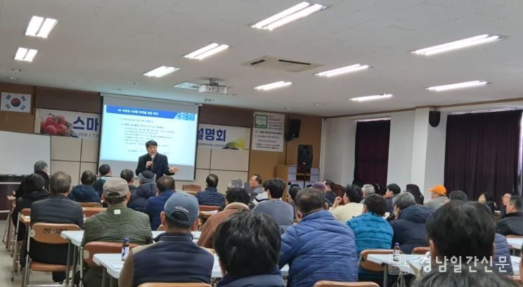 경남일간신문 | 밀양시는 지난 7일 산내면 얼음골사과발전협의회 대강당에서 사과 재배 농업인을 대상으로 ‘미래형 사과과원 조성을 위한 설명회’를 개최했다.