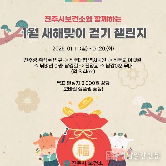 이번 1월의 ‘새해맞이 걷기 챌린지’는 11일부터 오는 20일까지 진행되며, 진주성 촉석문 입구부터 남강 야외무대까지 약 3.4km 구간을 걷는 코스로 운영된다.