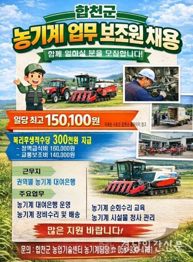 경남일간신문 | 합천군은 농기계대여은행 운영체계를 강화하고 농업인 영농 편의를 높이기 위해 2026년 농기계 업무보조원 기간제근로자 9명을 채용한다고 14일 밝혔다.