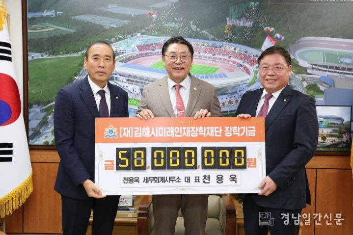 경남일간신문 | 김해시미래인재장학재단은 15일 천용욱 세무회계사무소에서 올해부터 5년간 5,000만원을 기탁하기로 했다고 밝혔다.