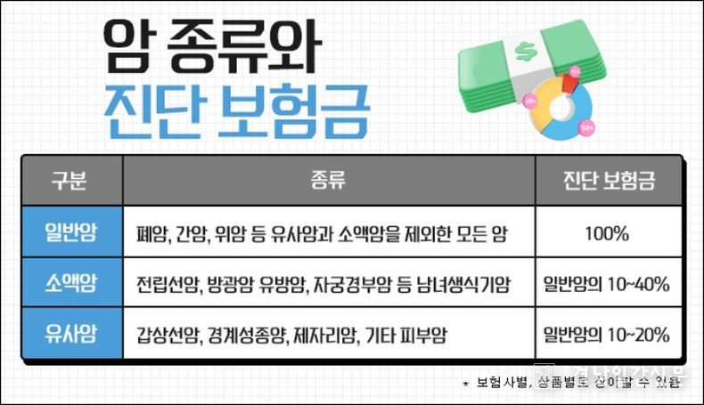 보험사에서 암을 구분할 때 보통 경계성종양, 제자리암, 갑상선암, 기타피부암 등으로 대표되는 유사암과 유방암, 방광암, 전립선암, 자궁암 등으로 대표되는 소액암, 그리고 뼈암이나 뇌암, 췌장암 등은 고액암으로 구분한다. 이들을 제외한 나머지 암은 일반암으로 분류한다. 보통 치료비가 많이 드는 고액암이 다른 암보다 진단금이 높은 편이지만, 보장을 넓게 받기 위해서는 일반암 진단비를 늘리는 것이 유리하다. 또한, 소액암이나 유사암은 발생빈도가 높고 상대적으로 치료비가 적게 들어 일반암 진단비의 약 10%~20% 정도만 지급되므로 사전에 보장금액을 알아볼 필요가 있다.