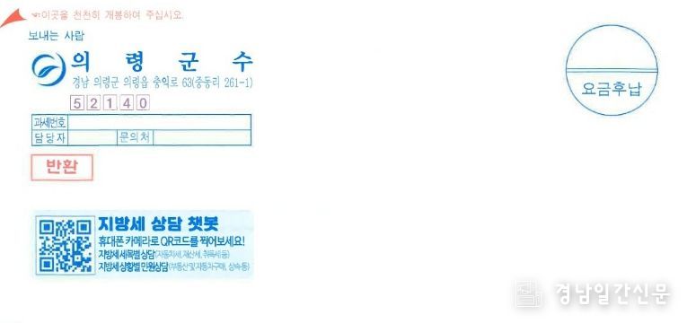경남일간신문 | 의령군은 지방세 고지서 전면에 ‘지방세 챗봇 상담서비스’ QR코드를 삽입해 발송한다고 밝혔다.