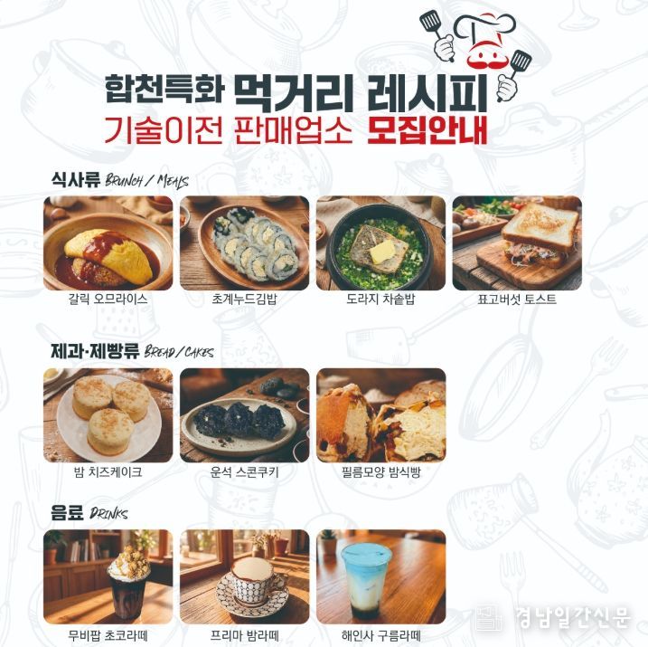 경남일간신문 | 합천군은 지역 특산물을 활용한 차별화된 먹거리를 보급하고 관광객들에게 풍성한 미식 경험을 선사하기 위해 ‘합천특화 먹거리 레시피 기술이전 및 판매업소’를 2026년 1월 19일부터 2월 20일까지 모집한다고 밝혔다.