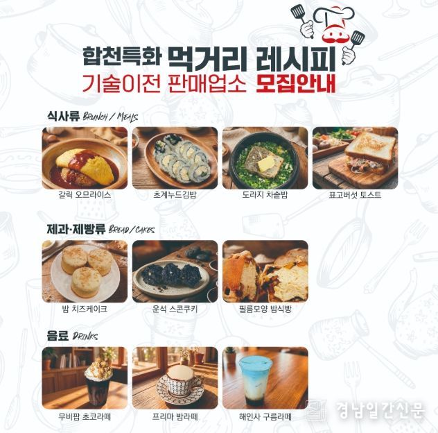 경남일간신문 | 합천군은 지역 특산물을 활용한 차별화된 먹거리를 보급하고 관광객들에게 풍성한 미식 경험을 선사하기 위해 ‘합천특화 먹거리 레시피 기술이전 및 판매업소’를 2026년 1월 19일 월요일부터 2월 20일 금요일까지 모집한다고 밝혔다.