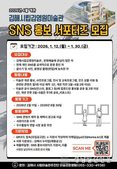 경남일간신문 | 김해시는 오는 2026년 4월 개관 예정인 ‘김해시립김영원미술관’을 알리고, 미술관의 개관 과정을 생생하게 기록하고 홍보할 'SNS 홍보 서포터즈'를 모집한다고 밝혔다.