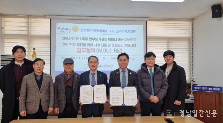 경남일간신문 | 진주시복지재단은 21일 진주시복지재단에서 국제로타리 3590지구 진주촉석로타리클럽과 저소득 한부모 가정의 구강 건강 증진을 위한 업무협약(MOU)을 체결했다.