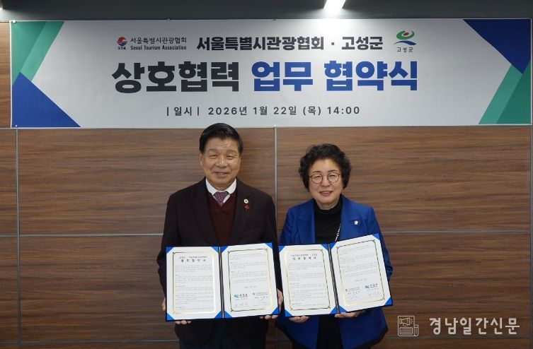 경남일간신문 | 경남 고성군은 1월 22일 서울특별시관광협회 회의실에서 서울특별시관광협회(회장 조태숙)와 지역 관광 활성화 및 관광산업 발전을 위한 업무협약(MOU)을 체결했다고 밝혔다.