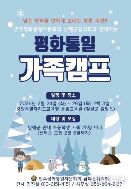 경남일간신문 | 민주평화통일자문회의 경남남해군협의회는 관내 초등학생과 그 가족을 대상으로 ‘2026 평화통일 가족캠프’ 참가자를 모집한다고 밝혔다.