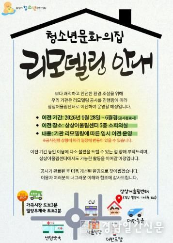 경남일간신문 | 경남 밀양시는 청소년들에게 더욱 안전하고 쾌적한 활동 환경을 제공하기 위해 청소년문화의집 리모델링을 본격 추진하며, 지난 28일부터 가곡동 상상어울림센터(가곡동 830)로 임시 이전해 운영을 시작했다.