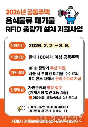 경남일간신문 | 거제시는 지난해에 이어 올해도 공동주택을 대상으로 음식물류 폐기물 RFID 종량기 설치 지원사업을 추진한다고 밝혔다.