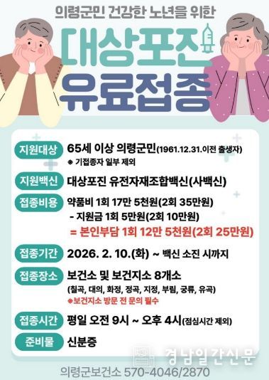 경남일간신문 | 의령군은 10일부터 65세 이상 의령군민을 대상으로 대상포진 예방접종 지원사업을 시행한다고 4일 밝혔다.