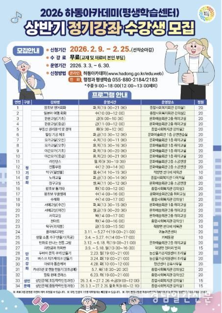 경남일간신문 | 하동군이 오는 2월 9일부터 25일까지 ‘2026년 상반기 하동아카데미(평생학습센터) 프로그램’ 수강생을 모집한다고 밝혔다.