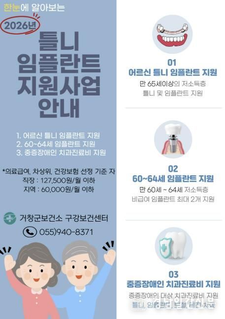 경남일간신문 | 거창군 보건소는 오는 9일부터 27일까지 치아 상실로 식사와 일상생활에 불편을 겪고 있는 저소득층을 대상으로 틀니, 임플란트 지원사업 신청을 받는다.