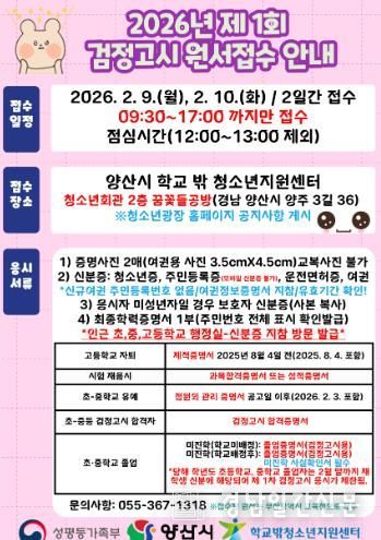 경남일간신문 | 양산시 학교 밖 청소년지원센터는 학교 밖 청소년들의 2026년 제1회 검정고시 응시를 지원하기 위해 대리 원서접수처를 운영한다.