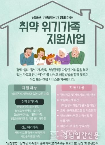 경남일간신문 | 남해군 가족센터는 위기 상황에 처한 가정과 다양한 형태의 가족을 지원하기 위해 2026년 ‘취약·위기가족지원사업(온가족보듬사업)’을 추진한다고 밝혔다.
