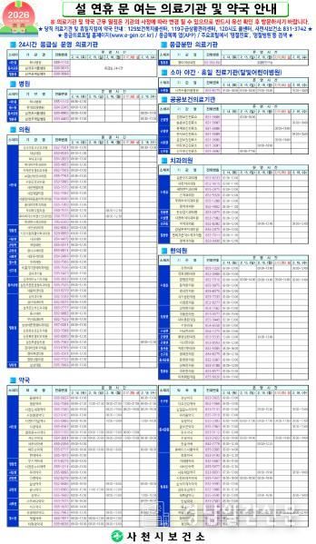 사천시보건소 관계자는 “설 명절 동안 시민들이 안심하고 연휴를 즐길 수 있도록 비상진료체계 유지에 만전을 기하고 있다”며, “의료 이용에 불편함이 없도록 행정적 지원을 아끼지 않겠다” 고 말했다.