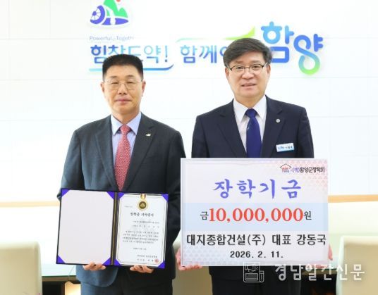 경남일간신문 | (재)함양군장학회는 2월 11일 대지종합건설(주) 강동국 대표가 함양군 지역 학생들을 위해 장학금 1,000만 원을 기탁했다고 밝혔다.
