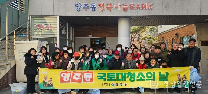 경남일간신문 | 양산시 양주동 행정복지센터는 12일 고향을 방문할 귀성객들에게 깨끗하고 포근한 마을 이미지를 전하기 위해 설 맞이 국토대청소를 실시했다.