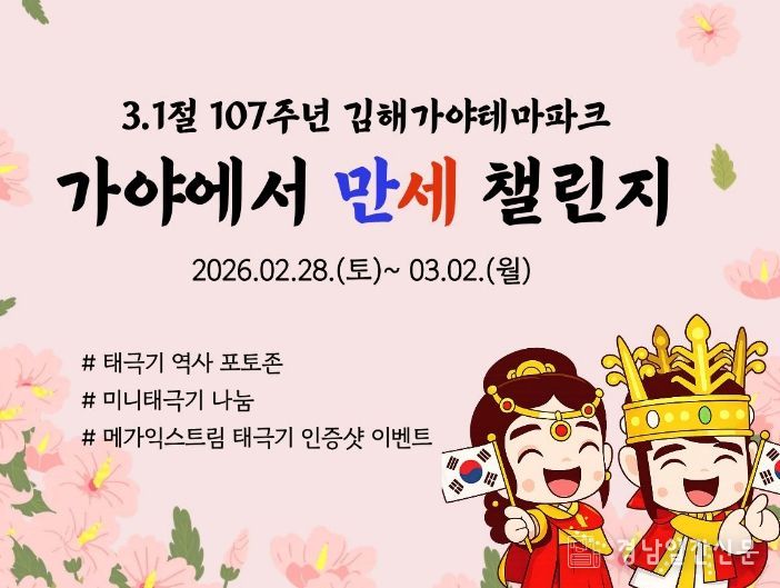 경남일간신문 | (재)김해문화관광재단 김해가야테마파크가 3·1절 107주년을 맞아 방문객과 함께하는 ‘가야에서 만세 챌린지’를 오는 2월 28일부터 3월 2일까지 3일간 진행한다.
