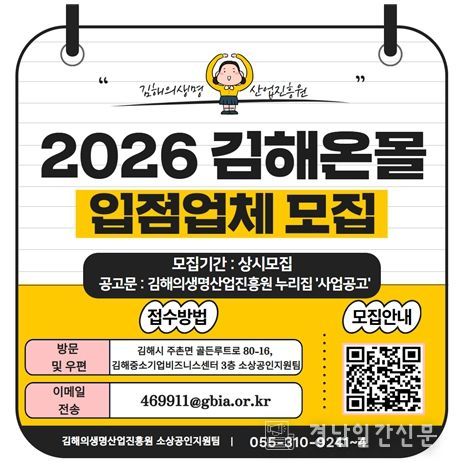 한편, 입점 신청은 김해의생명산업진흥원 누리집 ‘사업공고’를 통해 확인 가능하며, 자세한 사항은 진흥원 소상공인지원팀으로 문의하면 된다.